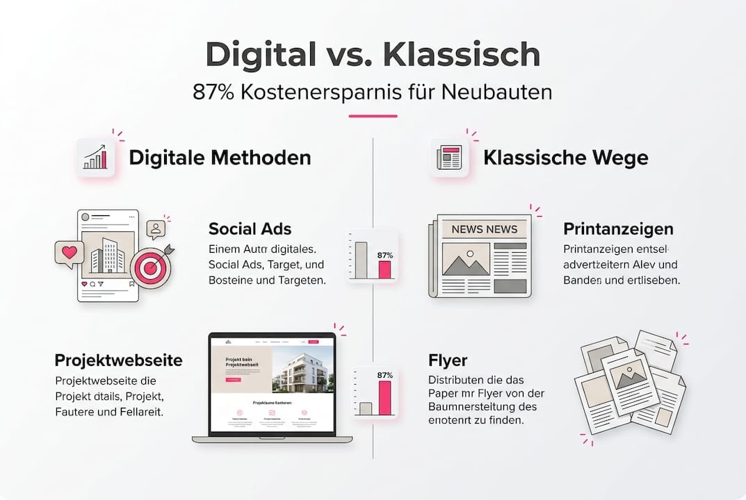 Wer Neubauprojekte heute noch ausschließlich mit Printanzeigen und Außenwerbung vermarktet, zahlt deutlich zu viel und erreicht zu wenige. Social Ads kosten pro Lead nur 8,50 € und sind damit 42% günstiger als klassische Printwerbung. Das ist kein kleiner Unterschied, das ist ein Paradigmenwechsel. Digitale Vermarktung bietet Immobilienentwicklern und Projektvermarktern nicht nur Kostenvorteile, sondern auch messbare Ergebnisse, gezielte Zielgruppenansprache und innovative Formate wie 3D-Touren. Dieser Artikel zeigt dir die wichtigsten Strategien, erklärt konkrete Kostenbeispiele und gibt dir einen klaren Fahrplan für dein nächstes Neubauprojekt.
